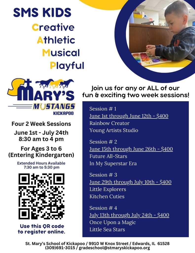 June 30th & July 1st @ St. Mary’s for boys & girls in Kindergarten through 8th grade. Click on the photo below to register: